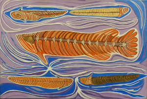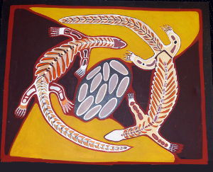 Goanna painting depicts a family of a man and woman with a child and a dingo hunting the male and female goanna and their eggs. The goanna is a traditional food for the Kamor people and are in danger of becoming extinct since cane toads have invaded the area.