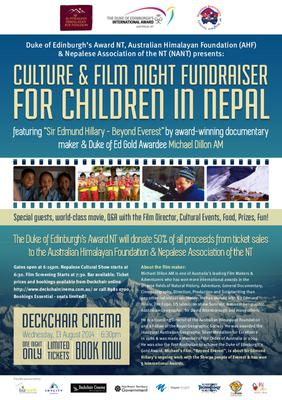 The Duke of Edinburgh's Award NT in partnership with The Australian Himalayan Foundation (AHF) & The Nepalese Association of the NT (NANT) presents a fantastic cultural delight in support of Nepalese children, on Wednesday August 13, 6:30pm at the Deckchair Cinema. The feature movie "Sir Edmund Hillary - Beyond Everest" is by award-winning documentary maker & Australia's first ever Duke of Ed Gold Awardee, Michael Dillon AM. The film is on the life of Sir Edmund Hillary, a 20th century explorer and mountaineer who rose to fame as the first man to reach the peak of Mt. Everest along with fellow climber Tenzing Norgay in 1953, and his ongoing humanitarian work with the Sherpa people of Everest - work that continues on to this day. Michael Dillon AM has made five adventure documentaries with Sir Edmund Hillary and his most recent, "Sir Edmund Hillary - Beyond Everest" has won five international awards.