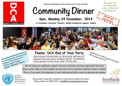 There is no regular funding for Community Dinners. If you would like to sponsor these growing events, make a donation, perform, cook or volunteer your help, please contact us on 8945 7347 or at mail@darwincommunityarts.org.au