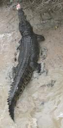 Large croc beside the road at the Finniss River Bridge.A saltwater crocodile of this size (above) could easily take an adult person. They move about a lot, particularly in the wet season and can turn up in unexpected places, even quite small streams and waterholes.